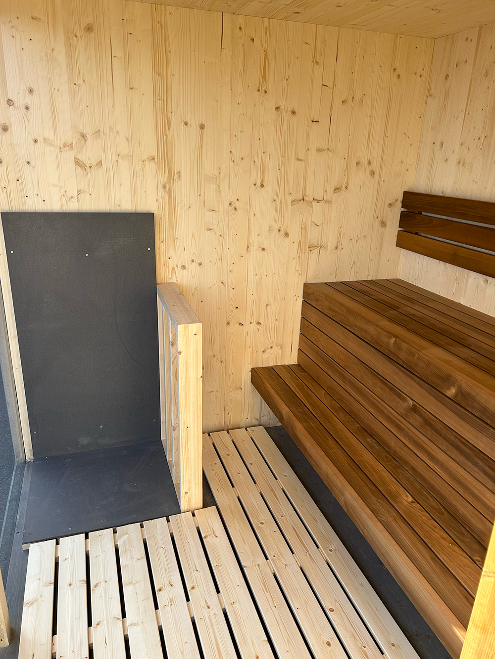 • Sauna: benches made of thermal alder, wood-burning Harvia 20 pro stove with chimney