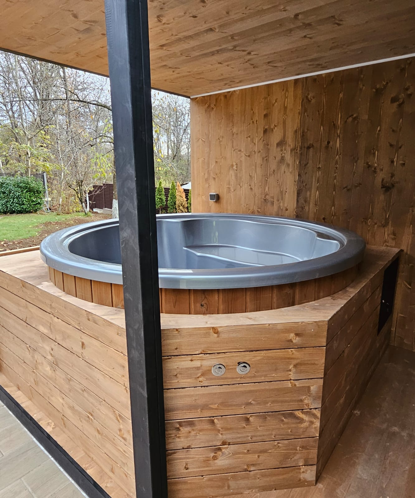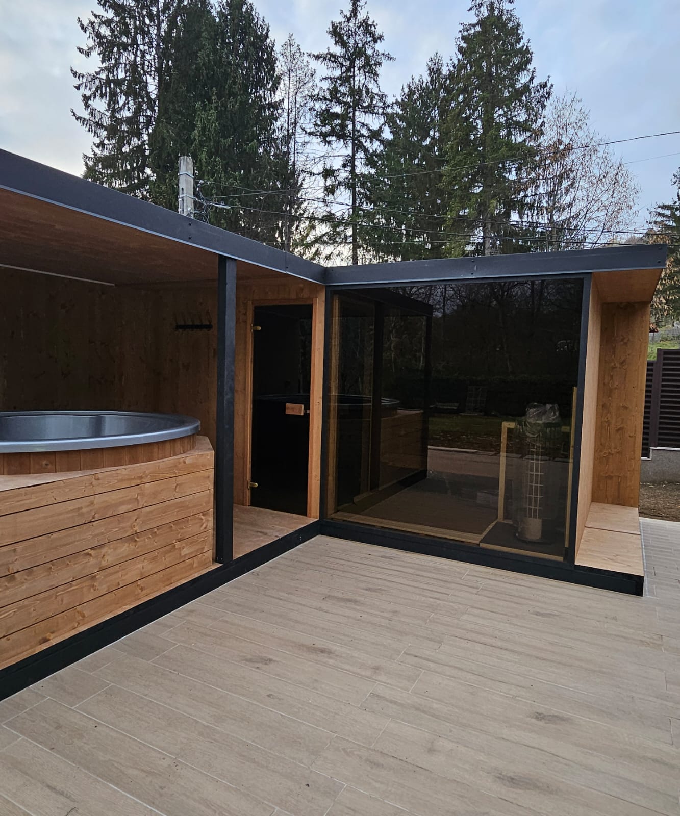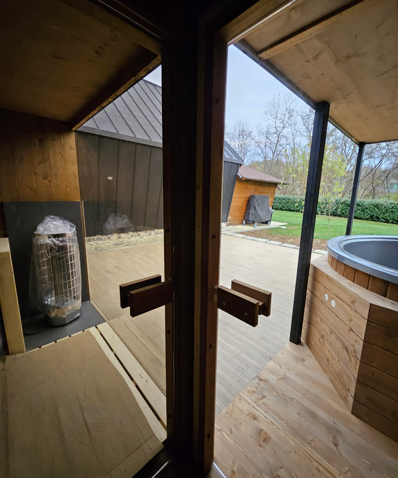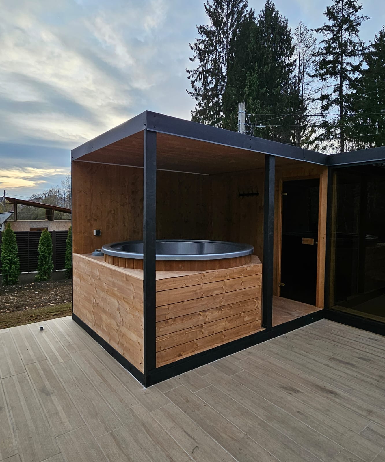 Our latest product is a sauna and hot tub in one, but made of two separate parts, harmoniously combined into one unique whole. This excellent design allows you to bask in a traditional sauna and at the same time enjoy the pleasant warmth of a relaxing hot tub.