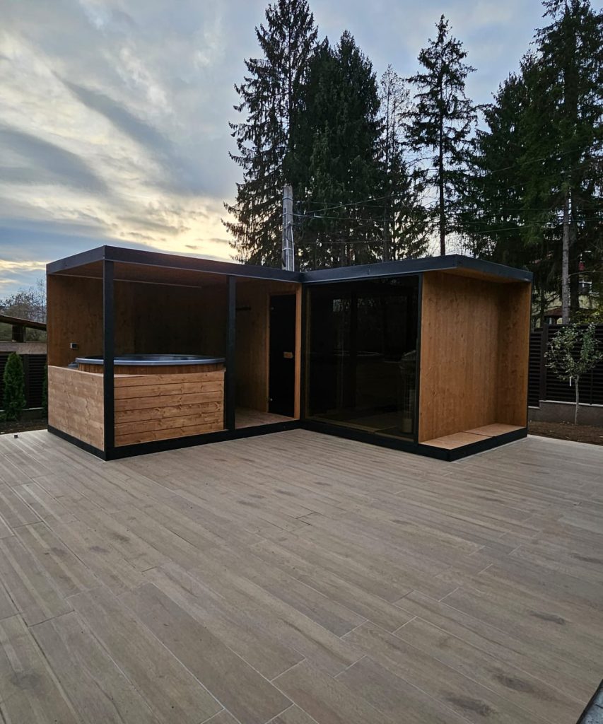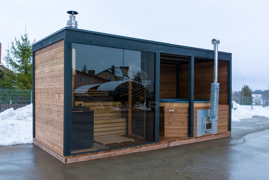 Our latest product is a sauna and hot tub in one, but made of two separate parts, harmoniously combined into one unique whole. This excellent design allows you to bask in a traditional sauna and at the same time enjoy the pleasant warmth of a relaxing hot tub.